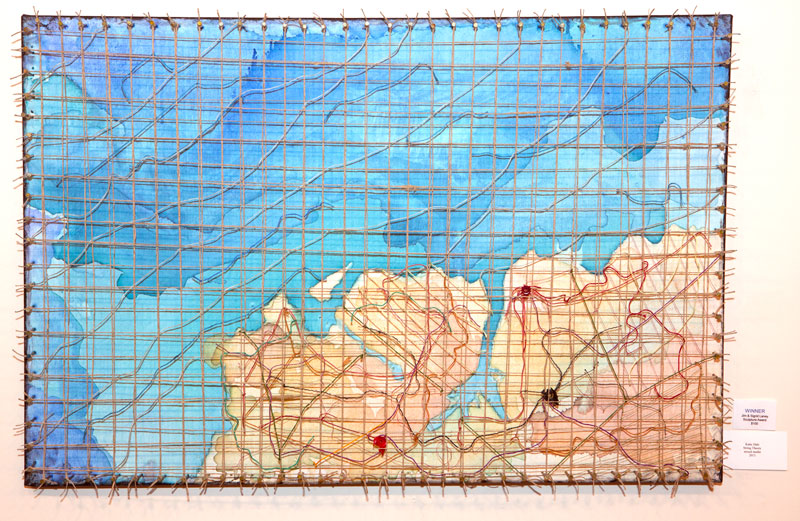 Hale's second submission, String Theory, won the Laney 3-D Award, a $100 prize sponsored by Jim Laney, the department's sculpture shop technician. The piece consists of a map overlaid with a string grid, which Hale says represents "how we are all connected on varying levels - emotionally, socially, physically."