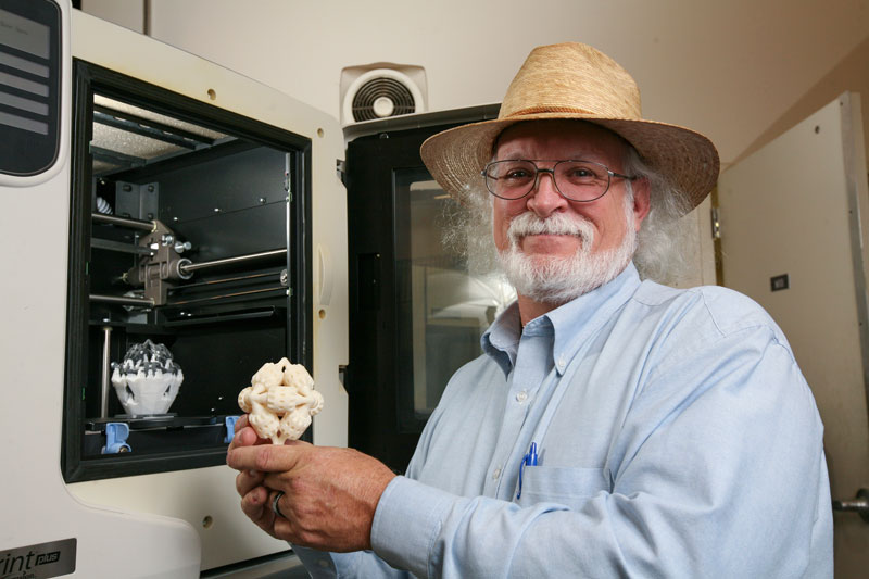 Stephen Collins, prototype development specialist, with a 3-D printer that is used for rapid fabrication. He is holding a brain gear that represents the "ship in a bottle" concept using additive fabrication. Collins manages the Engineering Design and Prototyping Facility at UAH.