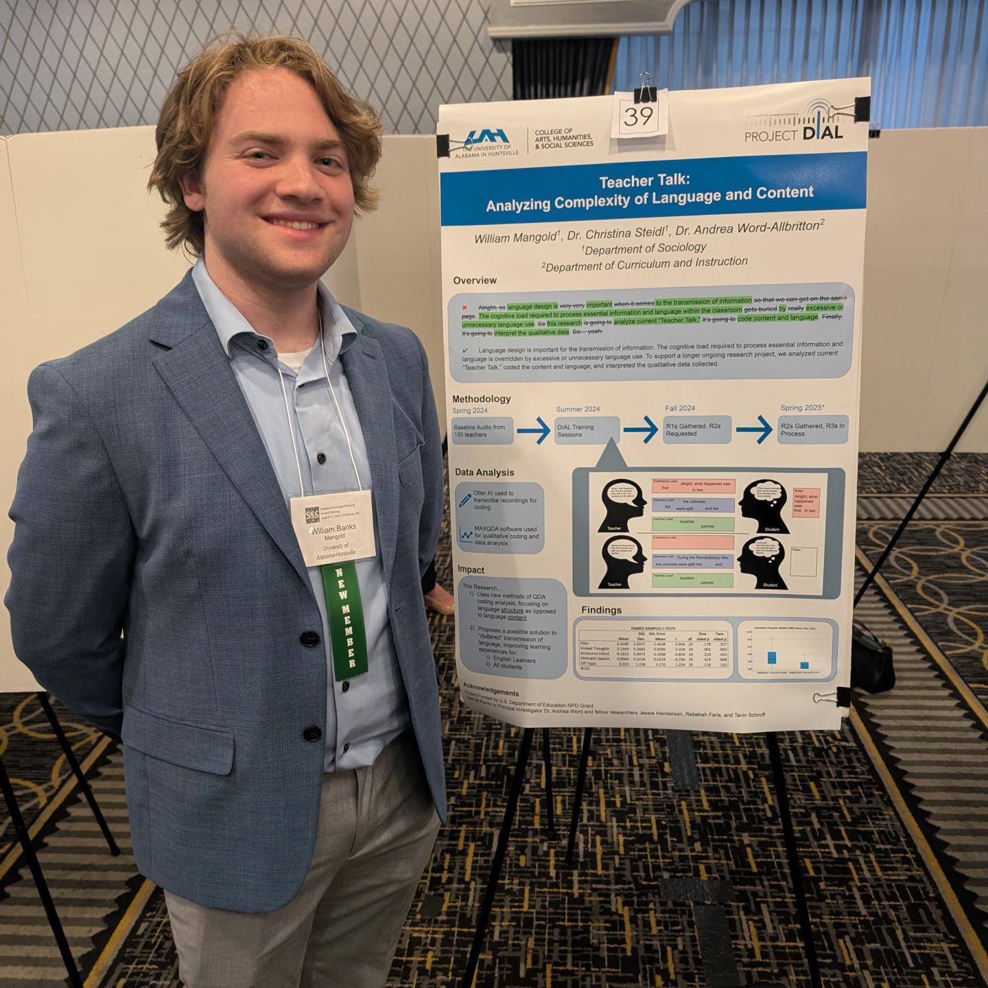 My sociology major at UAH has prepared me for my future career goals by giving me several research opportunities, all of which have utilized different methods and analysis approaches, allowing me to gain a wide range of experience. As one of my future career goals is to conduct research, I greatly value all of the projects I have had the honor to work on because of my sociology major. Another one of my future career goals is to teach college-level courses, which my sociology of education course has helped me to prepare for. In this course, I learned in-depth about how students succeed and falter, barriers in education, and ways to approach learning and teaching. Understanding the sociology of education will allow me to structure my courses in the most effective and accessible manner in order to ensure I am doing all that I can to aid my students in their successes. It will also allow me to recognize the specific challenges that my students are facing in their courses, whether it is an internal or external challenge.
