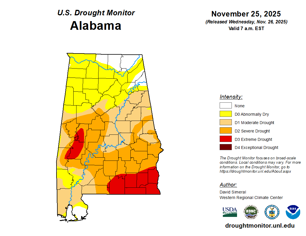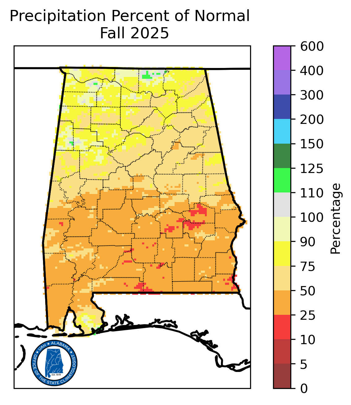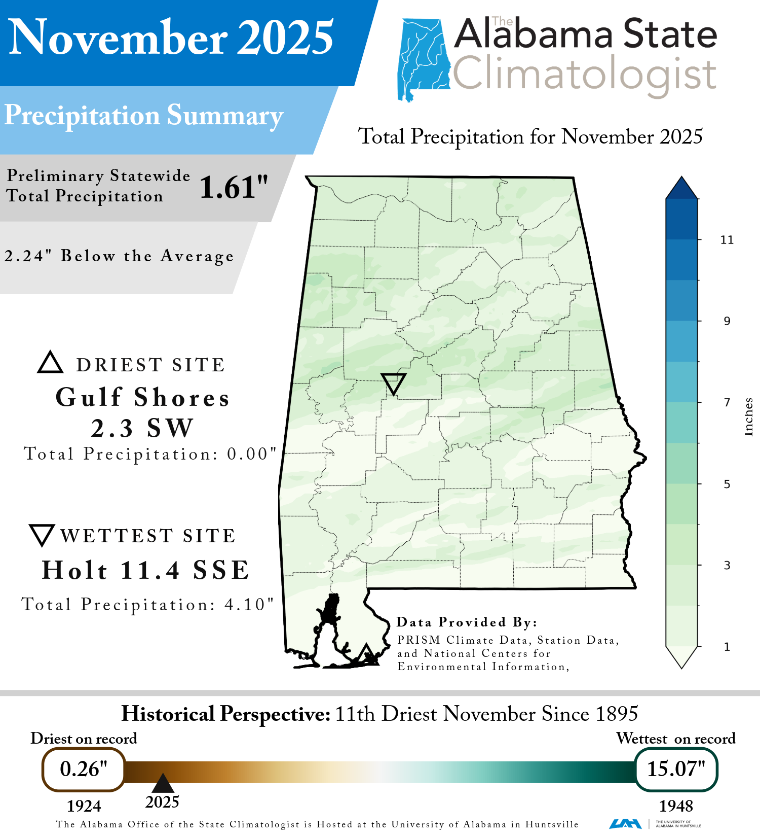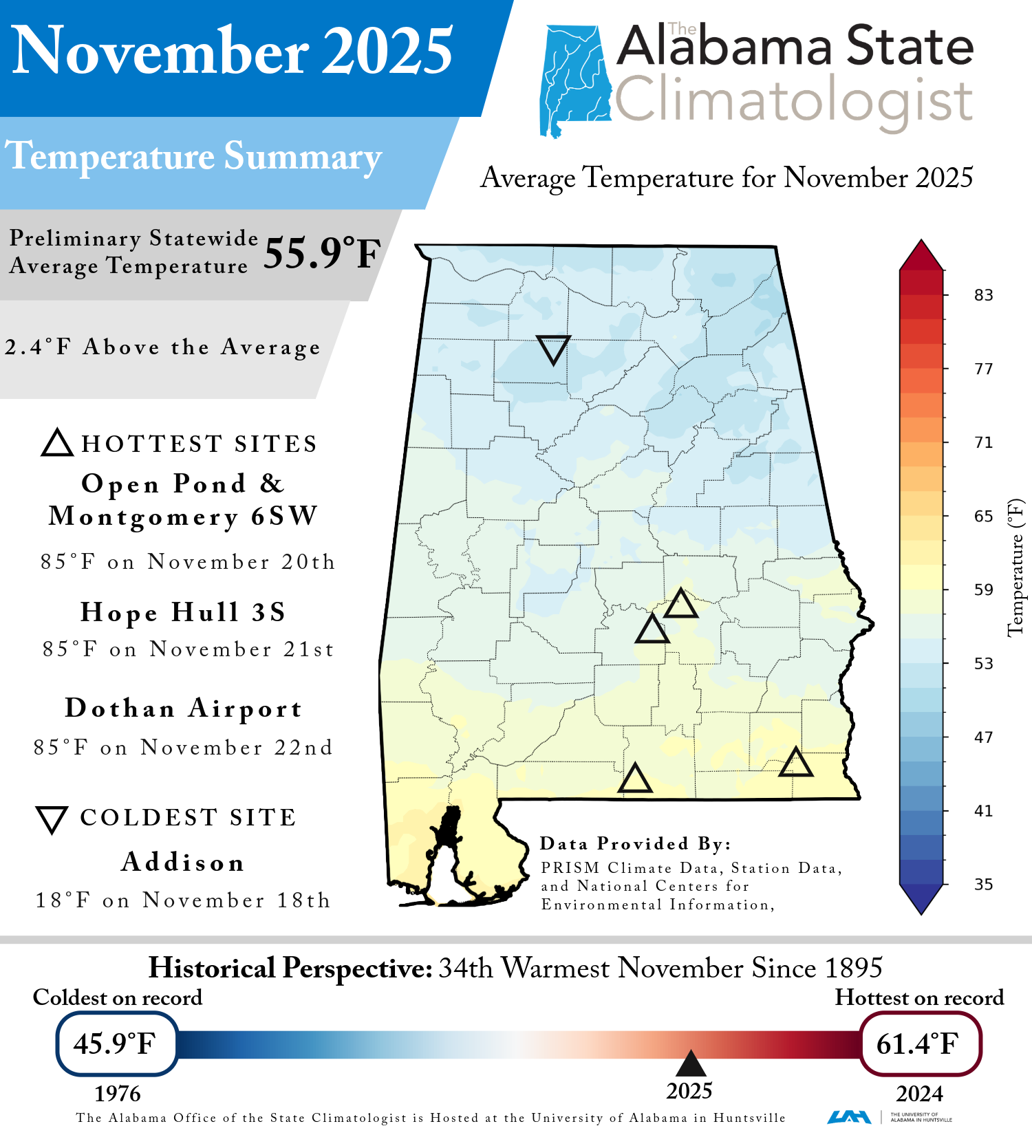 The Alabama Office of the State Climatologist provides monthly climate reports that analyze statewide temperature, precipitation, and drought trends. Each report also highlights how that's month’s climate compared to long-term historical normals. A summary of every monthly report is featured on this page, with options to view the full report in PDF format or explore the complete climate report archive. Download the Full Monthly Climate Report Browse the Monthly Climate Report Archive Alabama Climate Report: November, 2025 Brought to you by the Alabama Office of the State Climatologist Precipitation Summary Temperature Summary Drought Summary Fall Recap Figure 1. Summary graphic of precipitation totals and trends across Alabama for November 2025.Rainfall totals for Novmeber 2025 were more than 2 inches below the average with the Gulf Shores areas receiving 0.00 total inches. Data provided by PRISM Climate Data, station data, and National Centers for Environmental Information. Precipitation Summary (Figure 1) Alabama received an average of 1.61 inches of rainfall this November , which was 2.24 inches below the average 3.85 inches. This made it the 11th driest November on record for the state since 1895. The Gulf Shores area received the least rainfall this month, while parts of Tuscaloosa County saw the most rainfall. Precipitation Highlights Driest site: Gulf Shores 2.3 SW (Baldwin County) — 0.00 inches of rainfall Wettest site: Holt 11.4 SSE (Tuscaloosa County) — 4.10 inches of rainfall Driest November on record: 1924 — 0.26 inches of rainfall Wettest November on record: 1948 — 15.07 inches of rainfall Figure 2. Precipitation Percent of Normal for November 2025.Red and orange areas show locations that received less than 50% of normal rainfall, while green and blue areas indicate near- or above-normal precipitation. The entire state was drier than normal for November. Precipitation Percent of Normal (Figure 2) The entire state was drier than normal (indicated by yellow-dark red) Orange indicates areas that only received half of their normal November rainfall Communities along the Florida panhandle saw 0-5% of their normal rainfall totals The widespread deficit led to expanding drought, dry soils, and reduced streamflows across the state Figure 3. Summary graphic of temperature totals and trends across Alabama for November 2025.Average temperatures were slightly warmer than normal across the state, with the northern two-thirds of the state experiencing the lowest temperatures. Temperature Summary (Figure 3) Alabama’s average temperature for November 2025 was 55.9°F, which is 2.4°F warmer than the long-term average. This made it the 34th warmest November on record since 1895. Despite the overall warmth, a strong upper-level trough ushered cold Canadian air across much of the state from November 9-12. Temperature Highlights Hottest sites: Open Pond & Montgomery 6SW, Hope Hull 3S, & Dothan Airport— 85°F on November 20th, 21st, & 22nd respectively Coldest sites: Addison — 18°F on November 18 Coldest November on record: 1976— 45.9°F Warmest November on record: 2024— 61.4°F Figure 4. U.S. Drought Monitor map of Alabama for November 25, 2025.This map shows drought intensity across Alabama at the end of November 2025. Yellow areas indicate abnormally dry conditions, tan to orange areas represent moderate to severe drought, and dark red areas show extreme drought. By month’s end, the southern two-thirds of the state were in some level of moderate to extreme drought, with the worst conditions centered in West and Southeast Alabama. Drought Summary (Figure 4) Below-average rainfall and above average temperatures caused drought conditions to persist or worsen across much of the state. At the start of November, nearly 90% of the state was experiencing some level of abnormal dryness or drought, with the southern two-thirds under Moderate (D1) to Extreme (D3) Drought. The most severe conditions were focused in West Alabama near Marengo County and in the Southeast near the Florida Panhandle. By mid-month, drought had intensified in Southeast Alabama, and by the end of November, D3 Extreme Drought had expanded to cover 11% of the state (Figure 2). While the most dramatic changes occurred in the Southeast, much of the state saw stagnant conditions. This means the drought remained persistent, even if it did not intensify. Figure 5. Precipitation Percent of Normal for Fall 2025.Red and orange areas show locations that received less than 50% of normal rainfall, while green and blue areas indicate near- or above-normal precipitation. Most of the state was drier than normal this fall, with the southern half only receiving half of its normal seasonal rainfall. Fall 2025 Recap (Figure 5) As climatological fall (September, October, and November) wraps up, this is a good opportunity to take a look at how the season unfolded across Alabama. Statewide, this fall ranked as the 23rd warmest fall on record, with an average temperature of 65.9°F, which is 1.9°F above normal. Numerous observing stations across the state reported one of their ten warmest falls on record. This fall was also notably dry, ranking as the 18th driest on record statewide. Alabama averaged 6.36 inches of precipitation during the season, which is 4.1 inches below normal. While much of the state experienced drier-than-normal conditions, the southern half of Alabama was especially impacted, with many locations receiving less than 50% of their normal fall rainfall, as shown in Figure 3. Several stations recorded their driest fall on record, most notably Bay Minette, which experienced its driest fall since observations began in 1913. View the seasonal fall 2025 Precipitation and Temperature infographics.