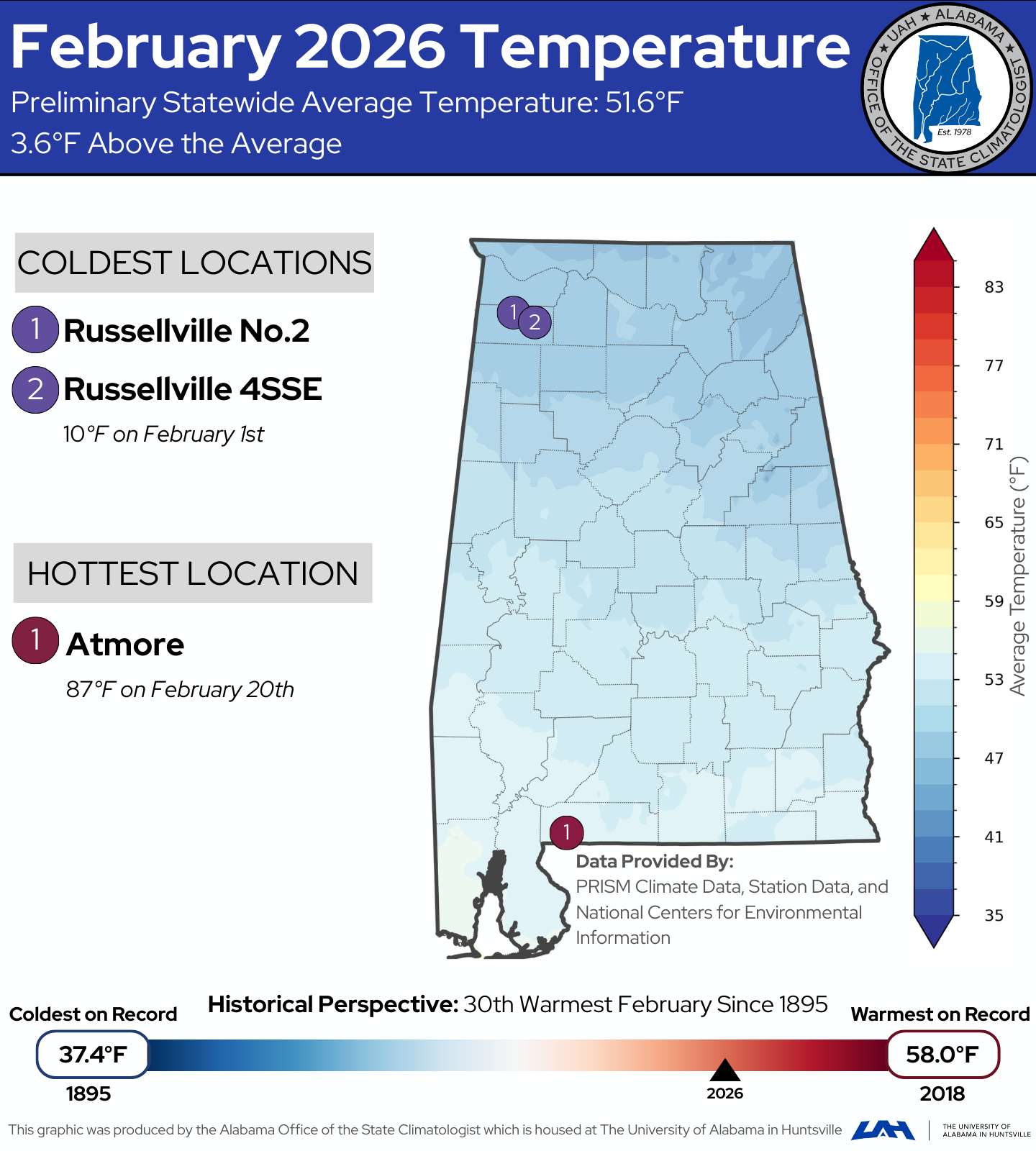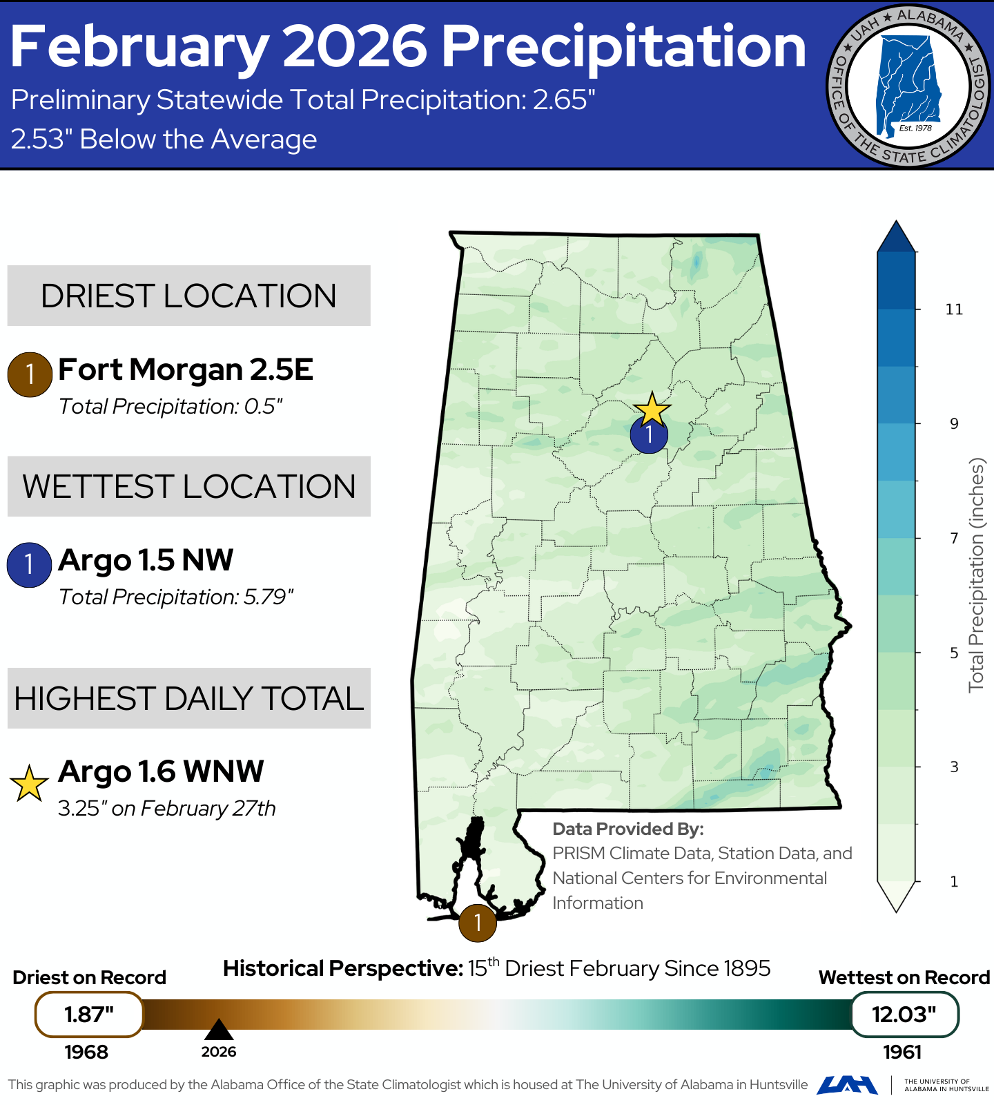 The Alabama Office of the State Climatologist provides monthly climate reports that analyze statewide temperature, precipitation, and drought trends. Each report also highlights how that's month’s climate compared to long-term historical normals. A summary of every monthly report is featured on this page, with options to view the full report in PDF format or explore the complete climate report archive. Download the Full Monthly Climate Report Browse the Monthly Climate Report Archive Alabama Climate Report: February, 2026 Brought to you by the Alabama Office of the State Climatologist Precipitation Summary Temperature Summary Drought Summary Winter 2025-2026 Summary Figure 1. Precipitation totals and trends across Alabama for February 2026.February was much drier than normal statewide, with 2.65 inches of rain on average. Data provided by PRISM Climate Data, station data, and National Centers for Environmental Information. Precipitation Summary (Figure 1) February was much drier than normal statewide. Preliminary statewide total precipitation was 2.65 inches, which is 2.53 inches below the long-term average. Most of Alabama experienced below-normal rainfall, although a few localized areas saw near-normal totals. Precipitation Highlights Driest site: Fort Morgan 2.5 E – 0.5 inches of rainfall Wettest site: Argo 1.5 NW – 5.79 inches of rainfall Driest February on record: 1968 — 1.87 inches of rainfall Wettest February on record: 1961 — 12.03 inches of rainfall Figure 2. Precipitation Percent of Normal for February 2026.February rainfall was below normal statewide, with the greatest deficits in the western half of the state (indicated by orange and red). Precipitation Percent of Normal (Figure 2) Much of Alabama received below-normal precipitation during February. West and South Alabama were the driest regions, with many areas receiving roughly 10–50% of normal rainfall. Some parts of East Alabama saw near-normal to slightly above-normal precipitation. Figure 3. Temperature totals and trends across Alabama for February 2026.February temperatures averaged 51.6°F, which is above normal statewide. Data provided by PRISM Climate Data, station data, and National Centers for Environmental Protection. Temperature Summary (Figure 3) Temperatures were warmer than normal across the entire state. The statewide average temperature was 51.6°F, which is 3.6°F above normal and ranks as the 30th warmest February on record. While brief periods of colder weather occurred early and late in the month, most of February was dominated by early spring warmth. Temperature Highlights Hottest sites: Atmore – 87°F on February 20th Coldest sites: Russellville No. 2 and Russellville 4 SSE – 10°F on February 1st Coldest February on record: 1895 — 37.4°F Warmest February on record: 2018 — 58.0°F Figure 4. February 2026 drought conditions Drought conditions intensified across much of Alabama during February, especially in central and southern regions. Drought Summary (Figure 4) Drought conditions worsened across Alabama during February. At the beginning of the month, nearly half of the state was in drought, with the most severe conditions in Southeast Alabama. As dry conditions persisted, drought expanded both in coverage and intensity. By the end of the month, nearly 100% of the state was experiencing some level of abnormal dryness or drought, with the worst conditions remaining in the Southeast and expanding into parts of Central and North Alabama. Winter 2025-2026 Summary Winter 2025–2026 was warmer and much drier than normal across Alabama. The statewide average temperature was 48.3°F, which is 1.7°F above normal and ranks as the 37th warmest winter on record. While the season included brief cold outbreaks, most of the winter was characterized by above-normal temperatures, especially during extended warm periods in December and February. Precipitation was significantly below normal statewide. Alabama received 10.67 inches of precipitation during the winter season, which is 4.85 inches below normal, making it the 11th driest winter on record. Dry conditions were consistent across most of the state, contributing to the expansion and persistence of drought conditions, particularly in southern and central Alabama. Snowfall was limited across the state, with only minor accumulations observed. The highest reported snowfall total was 1.5 inches, and many locations saw little to no winter precipitation in the form of snow or ice. For more information, read the full report. If you have any questions, please contact aosc@uah.edu.