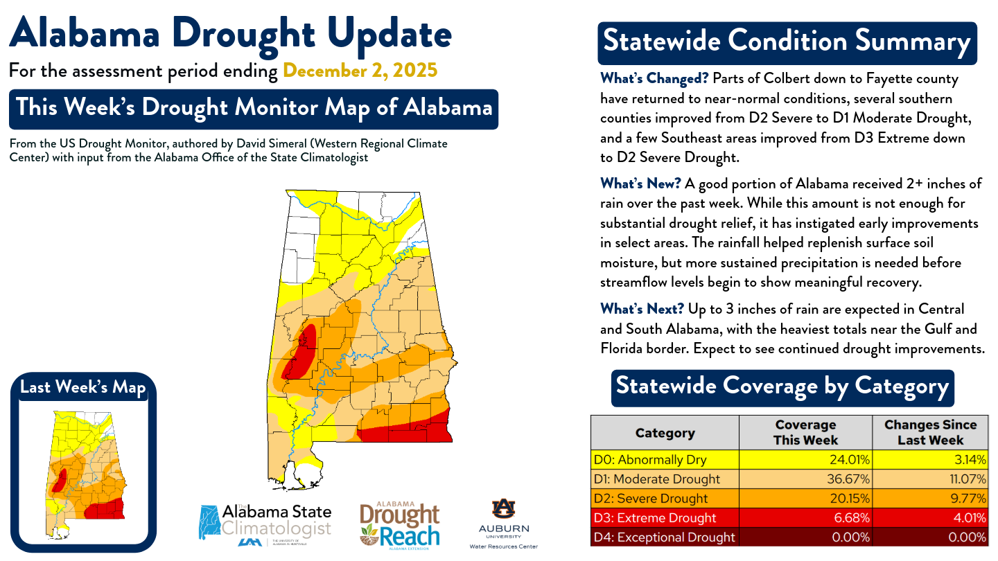 The Alabama Drought Update for December 2, 2025 shows slight drought improvements across the state.