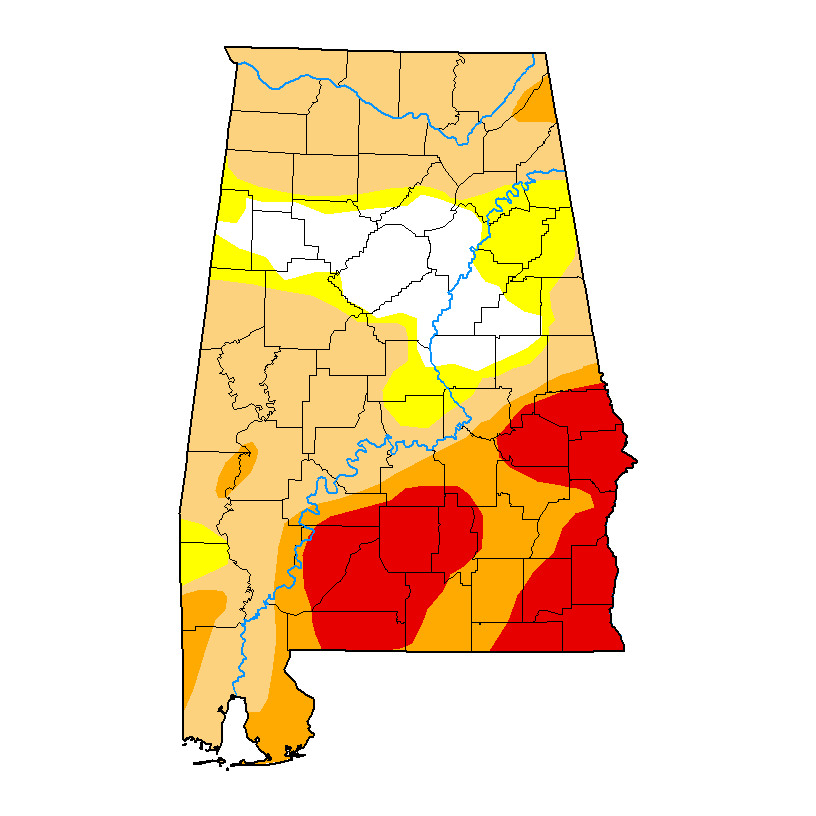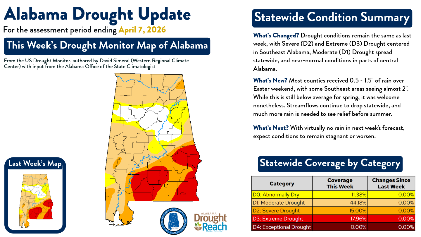 Drought Update for April 7, 2026 This Week's U.S. Drought Monitor Map of Alabama Statewide Condition Summary What's Changed? Drought conditions remain the same as last week, with Severe (D2) and Extreme (D3) Drought centered in Southeast Alabama, Moderate (D1) Drought spread statewide, and near-normal conditions in parts of central Alabama. What's New? Most counties received 0.5 - 1.5" of rain over Easter weekend, with some Southeast areas seeing almost 2". While this is still below average for spring, it was welcome nonetheless. Streamflows continue to drop statewide, and much more rain is needed to see relief before summer. What's Next? With virtually no rain in next week's forecast, expect conditions to remain stagnant or worsen. Statewide Coverage by Category CategoryCoverage This WeekChanges Since Last Week D0: Abnormally Dry 11.38% 0.00% D1: Moderate Drought 44.18% 0.00% D2: Severe Drought 15.00% 0.00% D3: Extreme Drought 17.96% 0.00% D4: Exceptional Drought 0.00% 0.00% Source: U.S. Drought Monitor, authored by David Simeral (Western Regional Climate Center) with input from the Alabama Office of the State Climatologist Drought conditions across Alabama were unchanged this week, with severe (D2) and extreme (D3) drought still centered in Southeast Alabama. Moderate drought (D1) remains widespread across much of the state, while parts of Central Alabama continue to see near-normal conditions. Most counties received around 0.5–1.5 inches of rain over Easter weekend, with some Southeast areas seeing closer to 2 inches, but this was still below typical spring rainfall and not enough to improve drought conditions. Streamflows continue to decline statewide, and with little to no rain expected in the coming week, conditions are likely to remain stagnant or worsen. Download the Alabama Drought Update Graphic View Past Updates Alabama Drought in the News Despite Recent Rain, Drought Persists Across Alabama: Op-ed from State Climatologist: Lee Ellenburg op-ed for AL.com | Mar. 29, 2026 Alabama Wildfire Danger Remains High as Drought, Low Humidity Fuel Fast-Moving Fires: WSFA 12 Emma Ellis | Mar. 29, 2026 Drought Resources Alabama Department of Economic and Community Affairs: Office of Water Resources Alabama Drought Reach: Auburn University Water Resources Center U.S. Drought Monitor for Alabama Alabama Drought.gov page NOAA National Integrated Drought Information System (NIDIS) NIDIS Southeast Drought Early Warning System (DEWS) Report drought conditions with CMOR Report daily rainfall with CoCoRaHS Assessing drought in the United States