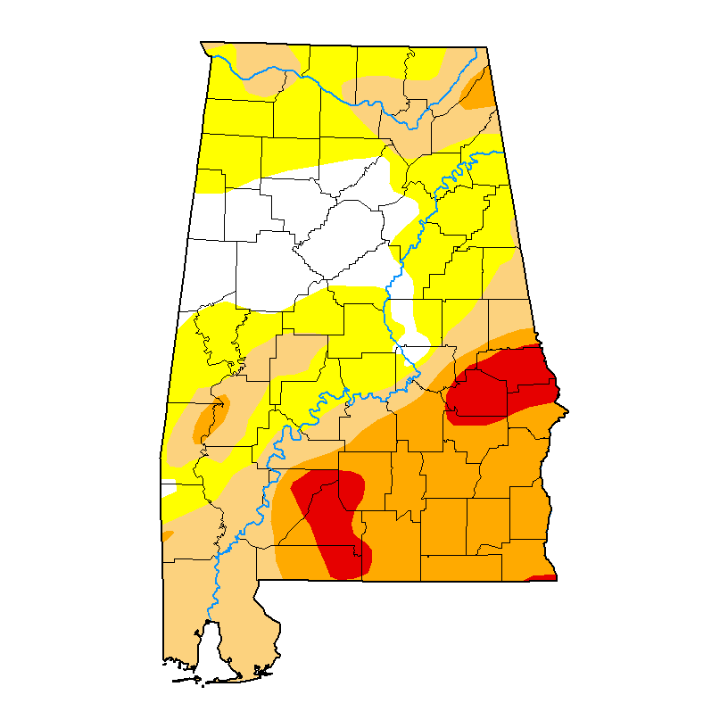 Drought Update for February 10, 2026 This Week's U.S. Drought Monitor Map of Alabama Statewide Condition Summary What's Changed? The most notable changes in drought conditions were in Southeast Alabama, where D2 Severe Drought was expanded toward Baldwin County and D3 Extreme Drought was added to areas around Conecuh and Macon Counties. What's New? Precipitation deficits continue to build across the state, especially in Southern counties where drought indicators continue to show moderate to extreme levels of drought over the past 3 months. What's Next? Most of Alabama is forecast to see 1+ inches of rain in the coming week, which could stave off worsening drought conditions. Statewide Coverage by Category CategoryCoverage This WeekChanges Since Last Week D0: Abnormally Dry 32.41% 4.49% D1: Moderate Drought 25.53% 2.67% D2: Severe Drought 20.78% 2.82% D3: Extreme Drought 6.27% 4.63% D4: Exceptional Drought 0.00% 0.00% Source: U.S. Drought Monitor, authored by Lindsay Johnson (National Drought Mitigation Center) with input from the Alabama Office of the State Climatologist Drought conditions worsened across parts of Alabama this week, particularly in the southern half of the state. Extreme Drought (D3) was introduced to areas around Macon and Conecuh counties, while Severe Drought (D2) expanded toward Baldwin County. Overall, Extreme Drought coverage increased by about 5%. Precipitation deficits continue to build, especially across southern counties, where drought indicators reflect moderate to extreme dryness over the past three months. Much of the state is forecast to receive 1 inch or more of rainfall in the coming week, which could stave off worsening conditions. Download the Alabama Drought Update Graphic View Past Updates Alabama Drought in the News Alabama Farmers Feeling Impacts of Ongoing Drought: WAKA 8 Justin Walker | Oct. 13, 2025 Alabama Drought Deepends as Water Levels Drop, Fire Danger Rises: WSFA 12 James Giles | Oct. 2, 2025 Alabama Farmers Facing Tough Year with Drought: Alabama Extension | Sept. 30, 2025 Drought Resources Alabama Department of Economic and Community Affairs: Office of Water Resources Alabama Drought Reach: Auburn University Water Resources Center U.S. Drought Monitor for Alabama Alabama Drought.gov page NOAA National Integrated Drought Information System (NIDIS) NIDIS Southeast Drought Early Warning System (DEWS) Report drought conditions with CMOR Report daily rainfall with CoCoRaHS Assessing drought in the United States