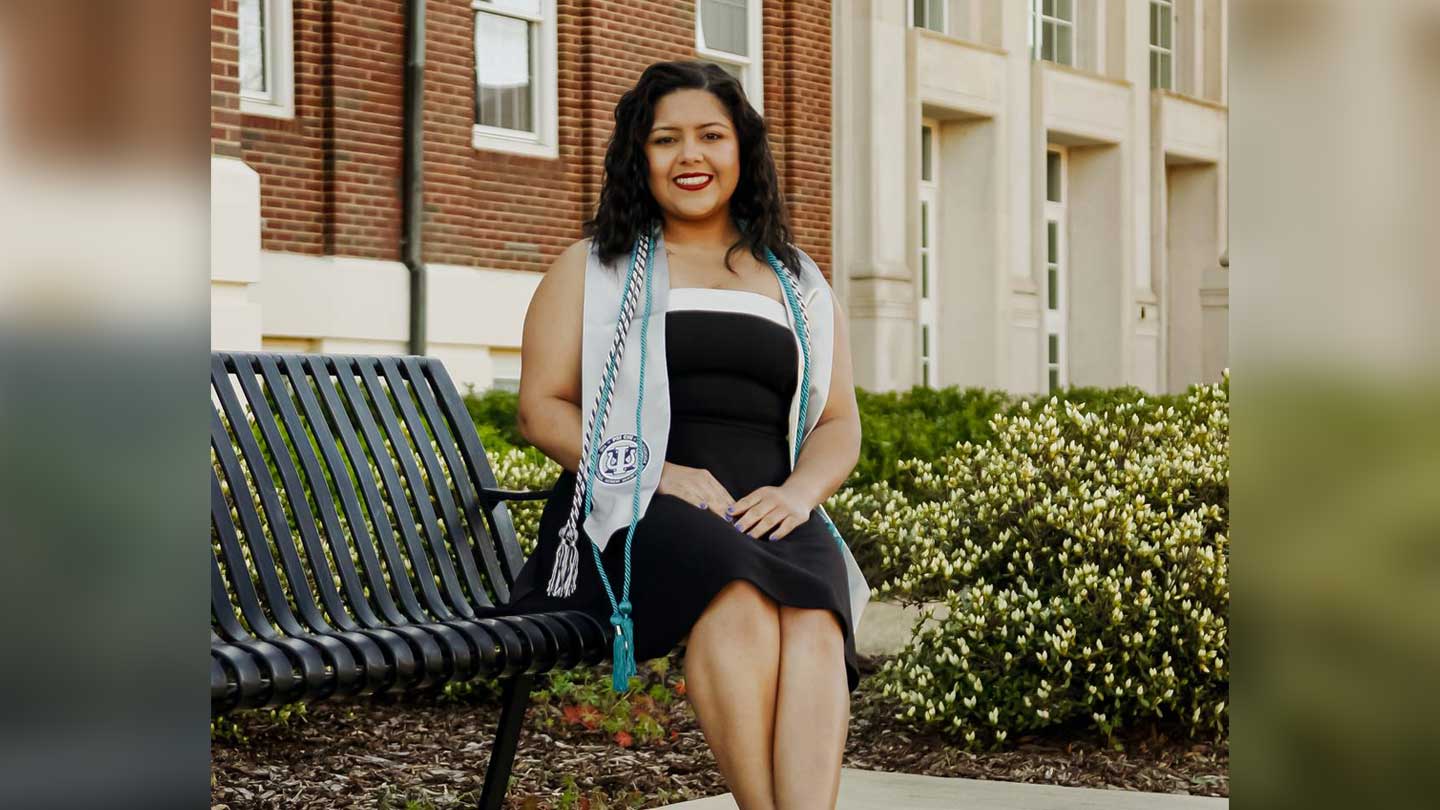 Alissa Corbin sits outside Morton Hall on the campus of The University of Alabama in Huntsville (UAH) where she spent much of her time earning a bachelor’s degree with a double major in psychology and sociology. She’s wearing the stole and cords for her graduation from UAH, which will happen on May 4, 2026, during commencement ceremonies at the Von Braun Center Propst Arena.