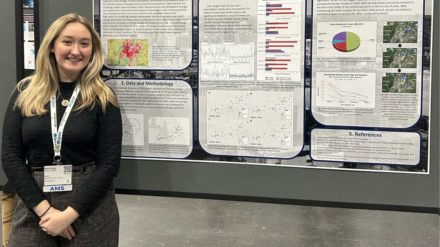 Wallner’s achievements highlight the impact of UAH’s research environment in helping students turn passion into profession. From a 10-year-old watching a powerful storm roll in to an award-winning researcher studying how cities shape the weather, her journey is a testament to where curiosity – and the right support – can lead.