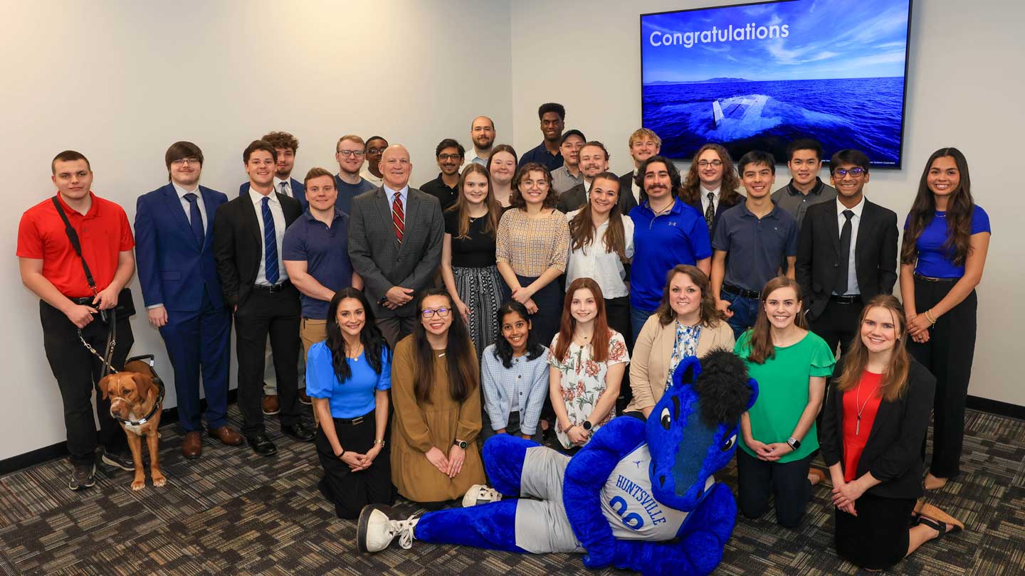 UAH students and recent graduates gather with UAH President Dr. Charles Karr and Lauren Youngblood, campus recruiter at Northrop Grumman, to celebrate more than 60 full-time and internship offers. Northrop Grumman is currently the leading employer of UAH alumni.