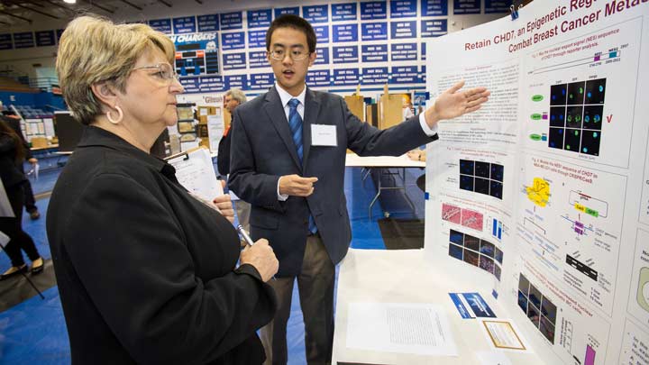 Written by: Diana LaChance April 17, 2017 The 2017 Alabama Science and Engineering Fair was held April 5 and 6 in Spragins Hall on the UAH campus. Michael Mercier | UAH More than 250 students from across the state took part in the 2017 Alabama Science & Engineering Fair (ASEF), held April 6 and 7 in Spragins Hall on The University of Alabama in Huntsville (UAH) campus. Both category and special awards were given out at the event, which concluded with an awards ceremony and banquet at the U.S. Space & Rocket Center. "Each year we are surprised by the quality of research and work done by Alabama’s middle and high school students,” says Vanessa Colebaugh, a research associate with the Institute of Science Education who serves as the event coordinator. “This year, however, was exceptional." The complete list of 2017 ASEF category award winners and special award winners can be found online. These awards included UAH scholarships, cash prizes, and trips. The ASEF is just one part of a much bigger framework of science and engineering fairs that take place around the world every year. In the U.S., students first compete at the school level, after which they may advance to the regional level. Alabama has five regional science and engineering fairs prior to ASEF, including the UAH-hosted North Alabama Science and Engineering Fair. The winners at the regional level go on to compete at ASEF, the state-level competition. Each state fair may also provide funding to send up to four overall finalists to the International Science and Engineering Fair (ISEF), which this year will be held from May 14 to 19 in Los Angeles, Calif. The four ASEF participants selected as 2017’s ISEF Finalists are as follows: Tucker Honeycutt (Covenant Christian Academy) Noel Lange (Auburn High School) Lucas Lynn (Wetumpka High School) Hemant Srivastava (Alabama School of Fine Arts) The 2017 ASEF was made possible by the generous support of the event’s sponsors, which included the Alabama Space Grant Consortium, National Aeronautics and Space Administration, and the U.S. Space & Rocket Center, Techni-Core Engineering, Toyota Motor Manufacturing Alabama Inc., ADTRAN, the National Space Club, the NDIA’s Tennessee Valley - SMD Working Group, the Southern Research Institute, Aerojet Rocketdyne, the Boeing Company, Raytheon Missile Systems, the Association of Energy Engineers, the Armed Forces Communications and Electronics Association, Dr. Louis Buckelew, Dynetics Inc., Ms. Katherine Orr, and the Huntsville Section of the Institute of Electrical and Electronics Engineers. Gallery Learn More UAH College of Science Contact Vanessa Colebaugh 256.824.4510 colebav@uah.edu